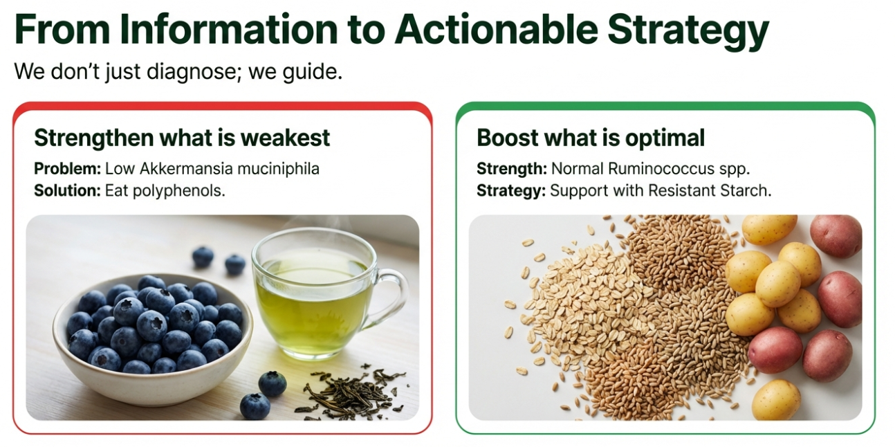 Receive personalized dietary recommendations based on your microbiome profile. Our AI suggests specific fibers and polyphenols to enhance your health.